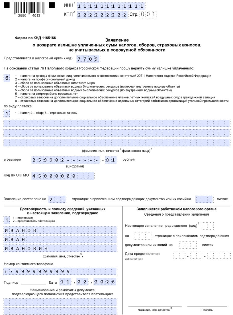 Бланк состоит из двух страниц. Заполняются они по той же логике, что и для предыдущего заявления, за исключением поля на первой странице, где из списка необходимо выбрать вид излишне уплаченного платежа, по которому возвращаете переплату. Кроме того, под суммой возврата указывается код ОКТМО. Заполненная первая страница выглядит так: