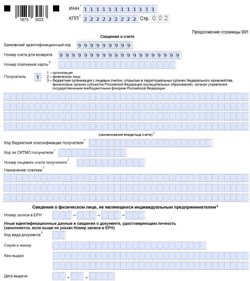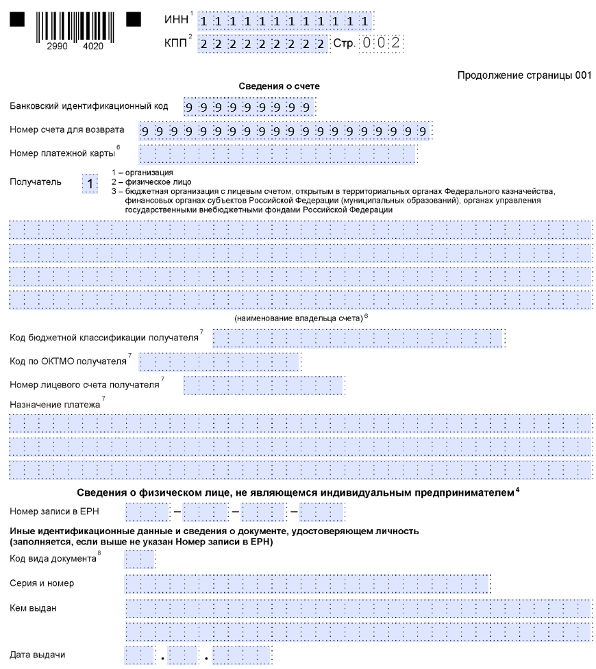 Переходим ко второй странице. Здесь указываем банковские реквизиты, тип получателя (в нашем случае это организация). Поля с примечанием «7»: наименование владельца счета, КБК, код по ОКТМО, номер лицевого счета, назначение платежа – требуется заполнять только в том случае, если возврат заявляет бюджетное учреждение. Заполненная вторая страница выглядит так: